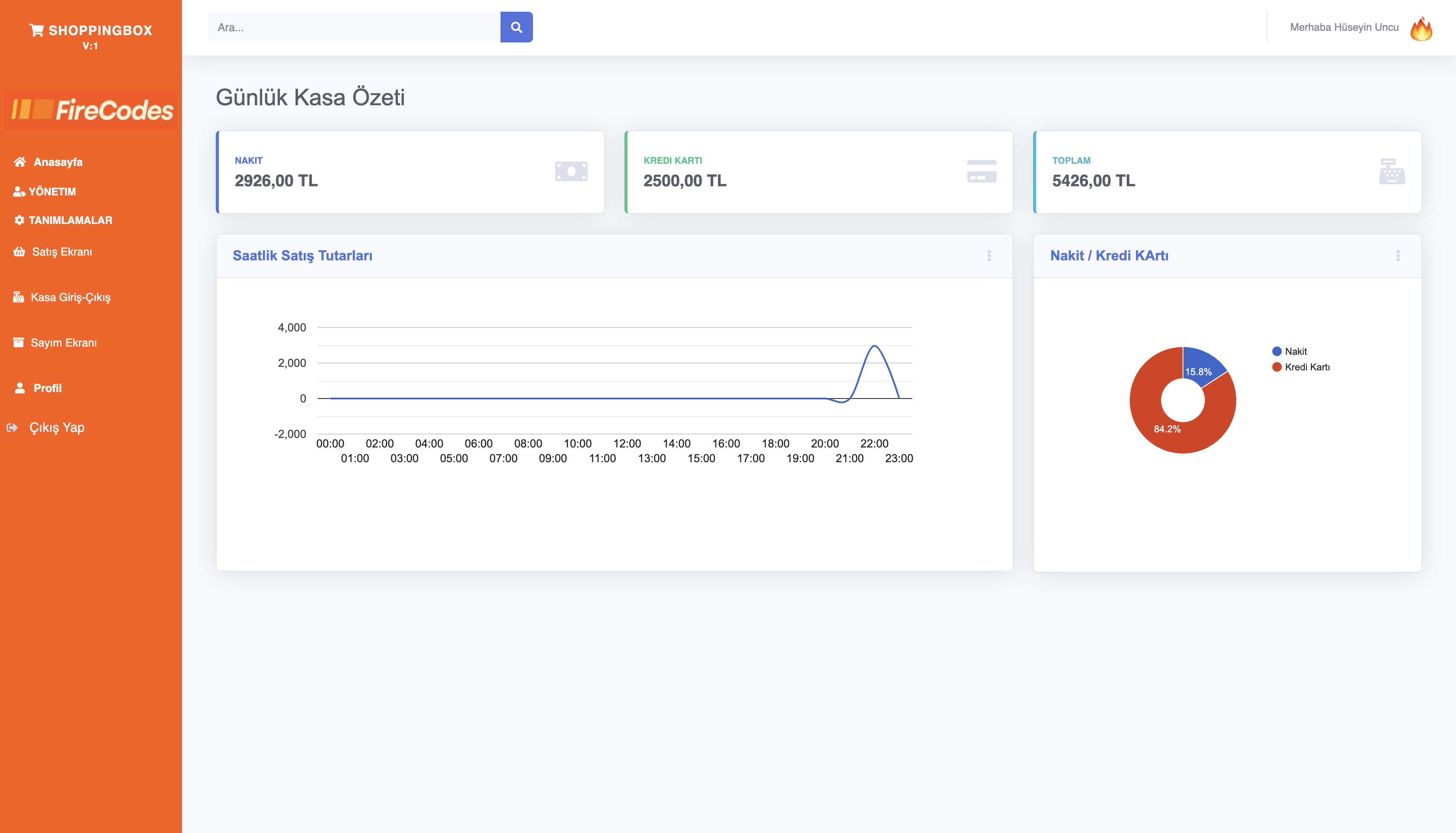 Oturum açtığınızda sizi karşılayan bu ekran sayesinde anlık kasa durumunu ödeme yöntemleri kategorisinde görebilir ve saat bazında günlük satış yoğunluğu grafiği ile işletmenizin gün içindeki satış performansını izleyebilirsiniz.